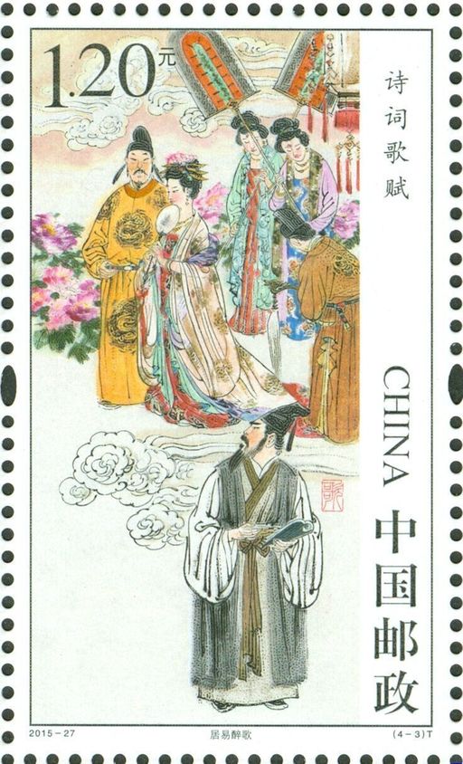 该套邮票由当代中国著名画家冯远设计,第一图表现了杜甫《春夜喜雨》的场景,诗人于画面前方,背景为春夜喜雨的诗意情景境,诗境与画境浑然一体。第二图表现了苏轼《水调歌头·明月几时有》的场景,画面中作者手执酒杯,仿佛在闭目思念自己的亲人。第三图表现的是白居易《长恨歌》的场景,画面中白居易正赋歌哀叹明皇与玉环的爱情悲剧,背景为唐明皇和杨玉环同游的场景。第四图表现了曹植《洛神赋》的场景,曹植若有所思,洛神容仪服饰华美,乘车而来,飘逸脱尘。