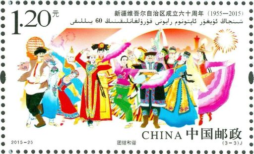 该套邮票将新疆维吾尔自治区六十年来的发展与成就有机的容纳于数字“60”当中,画面如同社会纪实照片,从社会发展、经济进步、人民幸福等不同角度表现了六十年来的巨大变化。邮票画面色调清新、内容丰富、层次清晰。