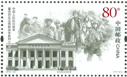 中国邮政定于2015年9月3日发行《中国人民抗日战争暨世界反法西斯战争胜利七十周年》纪念邮票1套13枚,小型张1枚。邮票内容分别为“九·一八”历史博物馆、东北烈士纪念馆、中国人民抗日战争纪念馆、上海淞沪抗战纪念馆、侵华日军南京大屠杀遇难同胞纪念馆、台儿庄大战纪念馆、延安革命纪念馆、八路军总部旧址纪念馆、百团大战纪念馆、平型关大捷纪念馆、冉庄地道战纪念馆、新四军纪念馆、滇西抗战纪念馆,小型张为中国人民抗日战争暨世界反法西斯战争胜利七十周年。全套邮票面值为20.80元。