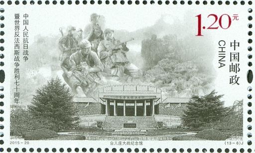 中国邮政定于2015年9月3日发行《中国人民抗日战争暨世界反法西斯战争胜利七十周年》纪念邮票1套13枚,小型张1枚。邮票内容分别为“九·一八”历史博物馆、东北烈士纪念馆、中国人民抗日战争纪念馆、上海淞沪抗战纪念馆、侵华日军南京大屠杀遇难同胞纪念馆、台儿庄大战纪念馆、延安革命纪念馆、八路军总部旧址纪念馆、百团大战纪念馆、平型关大捷纪念馆、冉庄地道战纪念馆、新四军纪念馆、滇西抗战纪念馆,小型张为中国人民抗日战争暨世界反法西斯战争胜利七十周年。全套邮票面值为20.80元。