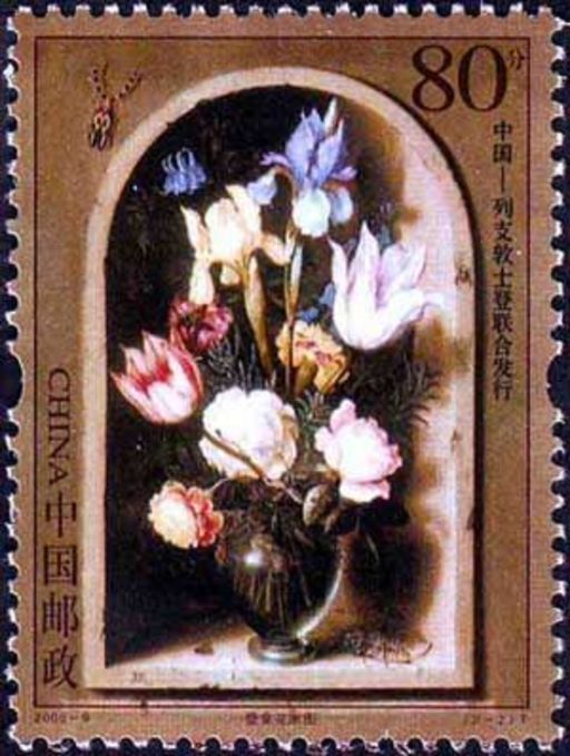 我国与列支敦士登联合发行《绘画作品》邮票一套2枚,邮票主图分别选取了我国明代著名画家陈洪绶的《玉堂柱石图》和藏于列支敦士登博物馆的《璧龛花束图》.陈洪绶是我国绘画史上杰出的画家,所绘《玉堂柱石图》系绢本、设色,画面上的玉兰清丽典雅,太湖石玲珑剔透,有很强的装饰性.《璧龛花束图》是17世纪著名画家博斯舍尔特的作品。