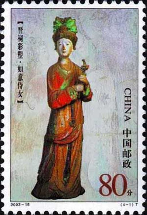 《晋祠彩塑》特种邮票图案选用的是33尊侍女塑像中具有代表性的“如意”、“持巾”、“奉玺”和“歌舞”4尊,也是古代古建筑中“六尚”之说中的“尚宝”、“尚室”、“尚玺”、“尚歌”、“尚舞”和“尚膳”的前四尚。