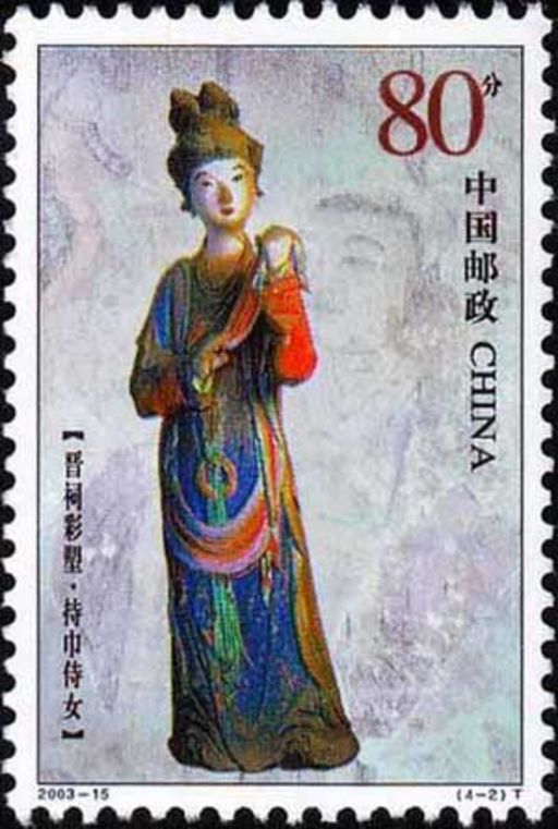 《晋祠彩塑》特种邮票图案选用的是33尊侍女塑像中具有代表性的“如意”、“持巾”、“奉玺”和“歌舞”4尊,也是古代古建筑中“六尚”之说中的“尚宝”、“尚室”、“尚玺”、“尚歌”、“尚舞”和“尚膳”的前四尚。