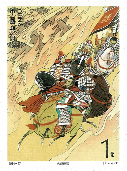 这套邮票的画面分别取自《三国演义》第四十八回“宴长江曹操赋诗,锁战船北军用武”描写曹操率八十万大军取江南欲一统华夏借酒兴横槊赋诗写出“对酒当歌,人生几何”的名句。第五十四回“吴国太佛寺看新郎、刘皇叔洞续佳偶”描述东吴就婚为名,赚刘备入关以讨荆州。刘备依诸葛亮之计成功娶亲之后安然返回。留下“赔了夫人又折兵”的名言。第六十七回“曹操平定汉中地、张辽威震逍遥津”说的是魏将张辽于逍遥津设伏,大破吴军的故事。第八十四回“陆逊营烧七百里、阳明巧布八阵图”说的是为收复荆州、报弟仇,刘备征吴,吴将陆逊于猇亭火烧刘备连营七百里大败蜀军的故事。小型张赤鏖兵描写孙、刘联军三万人于赤壁击败曹操八十万大军,从此确立了三国鼎足的局面,小型张在设计上打破了时空界限,以连环画形式将“借东风”,“水战”不同场面融为一体。