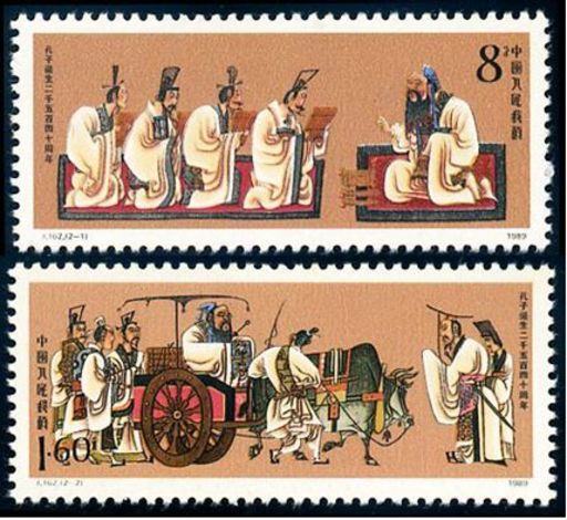 2-1为“杏坛讲学”。杏坛在今山东曲阜县城内孔庙大成殿前。相传当年孔子曾端坐在杏坛之上,辅导弟子读书,并弦歌教之。