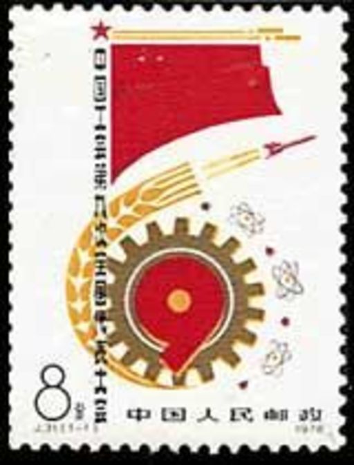 本套邮票共1枚。邮票图案由红旗、齿轮等构成。“中国工会第九次全国代表大会”直列构成旗杆;齿轮中心恰好组成“9”字,象征着这次大会;齿轮象征工人阶级,麦穗、导弹及卫星图案分别象征农业、国防及科技。四种图案又共同寓意四个现代化。作者通过上述象征手法,表现了大会主题。