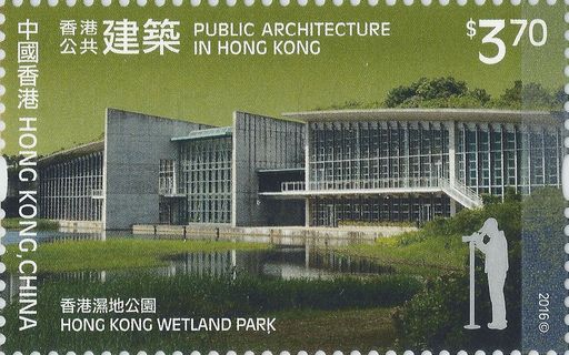 $3.70─香港湿地公园香港湿地公园的建筑结构,与四周自然环境浑然一体。公园的访客中心外墙主要以清水混凝土建成,并设有特意设计的绿化屋顶及木制百叶遮光屏障。湿地探索中心和三间观鸟屋均设于户外湿地保护区。邮票上的剪影勾画出使用双筒望远镜的观鸟者。