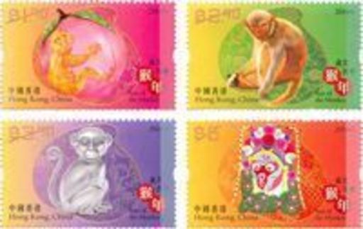 十二生肖是我国传统历史文化的一部分,蕴含各种祈望和寓意,是不少工艺品的题材。二○一六年岁次丙申是猴年,香港邮政特别发行贺岁生肖邮票第四辑第五套,一套四枚,通过以猴子为题材的不同工艺品,带出灵猴贺岁的主题。