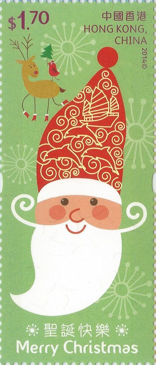 为庆祝这个普世欢腾的节日,香港邮政继二○○二年和二○○七年先后发行两套圣诞邮票,今年再推出一套圣诞邮票。这套邮票共有四枚,除了以造型可爱的圣诞老人、驯鹿、雪人和小天使为主题外,邮票设计更加入中式帆船、金紫荆雕塑、点心及尖沙咀钟楼等富香港特色的元素,设计别出心裁。