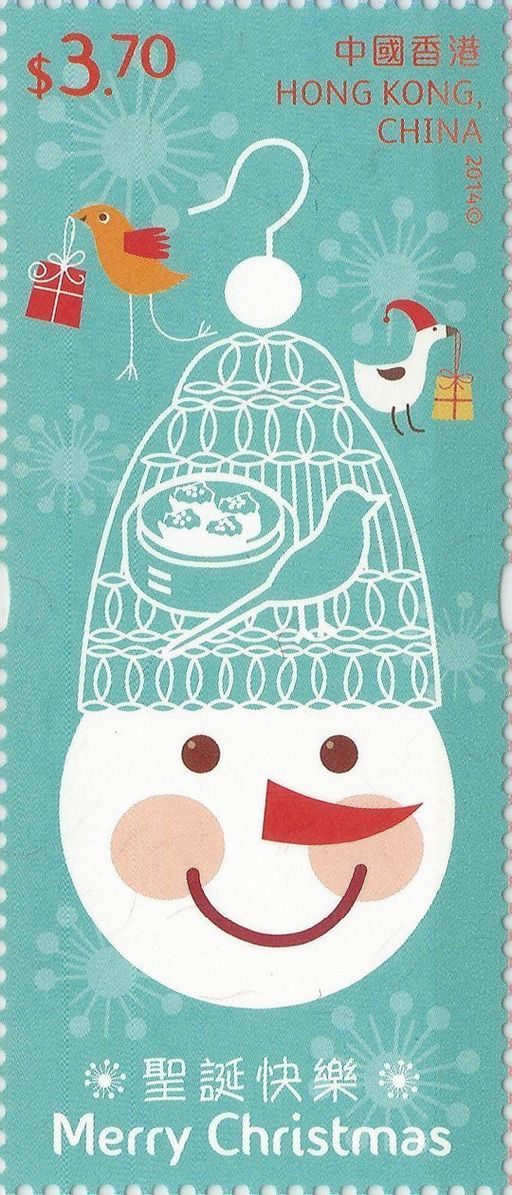 小全张以浅蓝色为背景,缀以雪地、圣诞树和雪人,以简约的设计带出温馨愉悦的节日气氛。香港邮政更发行一套四款自动粘贴邮票小型张,以狮子山(一元七角)、中式绳结(二元九角)、熊猫雪人(三元七角)和香港电影金像奖女神造型雕塑(五元)衬托,凸显富香港特色的圣诞节。