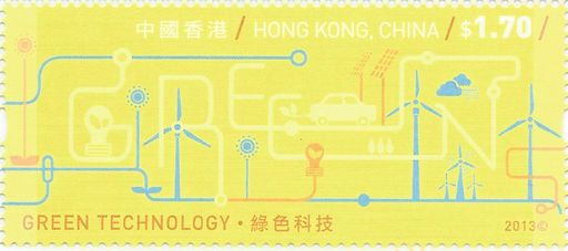 $1.70-绿色科技涵盖水和空气净化、废物管理、节能减排及可再生能源等范畴。公众的环保意识日渐提高,明白可持续发展非常重要;而业界在推动环保方面亦累积了丰富经验和专业技术。以上因素均有助环保行业的发展。邮票以简单线条,展现英文「GREEN」字样。用悭电胆、电动车、太阳能光伏板和风力发电机串连起来,代表绿色科技的元素,亦清楚传达环保信息。