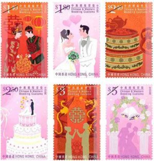 执子之手,与子偕老。婚姻是一对男女厮守一生的承诺,是一件终身大事。古今中外都以婚嫁仪式确立婚姻关系。婚礼不但为新人留下甜蜜难忘的回忆,亲友也可分享当中的喜悦。各地的生活环境和文化风俗不同,婚嫁习俗也各异。香港华洋杂处,婚嫁习俗既保留了传统的中式礼仪,亦融汇了西方的习惯。这套邮票多角度介绍香港的婚嫁文化,从中可见中西合璧的特色。