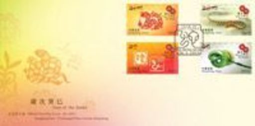 邮票小型张展示蛇形的木刻版画,版画所见,灵蛇衔珠,生动传神,衬以火舌及金碧辉煌的背景,鲜艳夺目,充满节日气氛。木刻版画是在木板上刻出反向图像,再印在纸上的一种版画艺术。此外,香港邮政发行丝绸邮票小型张,以高贵典雅的丝绸,衬托出灵蛇献瑞的尊贵气派,迎来吉祥如意的癸巳蛇年。