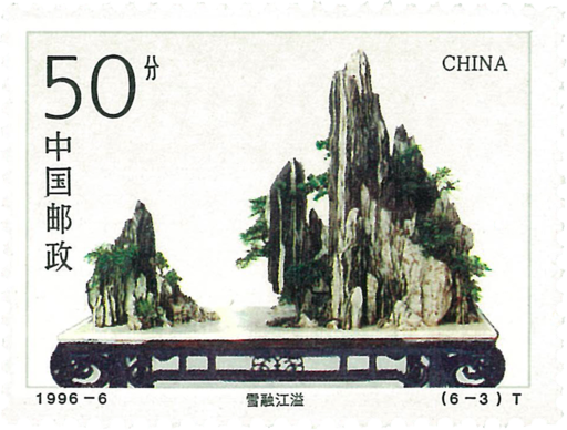 盆景为我国一种历史悠久的陈设品,是将木本植物、草本植物或水、石等,经过艺术加工,种植或市置在盆中,使其成为自然的缩影。依据不同用材,盆景可分为树桩盆景和山水盆景两大类。1981年发行的T61《盆景艺术》邮票属树桩盆景。而此套《山水盆景》邮票的8幅画面均以江苏靖江市的山水盆景为题材。山水盆景是以水、石为主,在浅口水盆中布置草、木、人物或其它装饰物,模仿秀丽或雄伟的自然景色,构成一幅立体的山水画给人以美的享受。