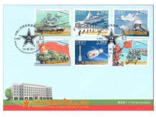 是次发行包括一套六枚邮票及一枚小型张,邮票图案展示了中国的核心军事装备,包括:ZTZ-96主战坦克、辽宁号航空母舰、歼-20隐形战机、东风-21D反舰弹道导弹、天宫二号,而第六枚邮票和小型张则展示了中国人民解放军驻澳门部队进驻澳门的情景。