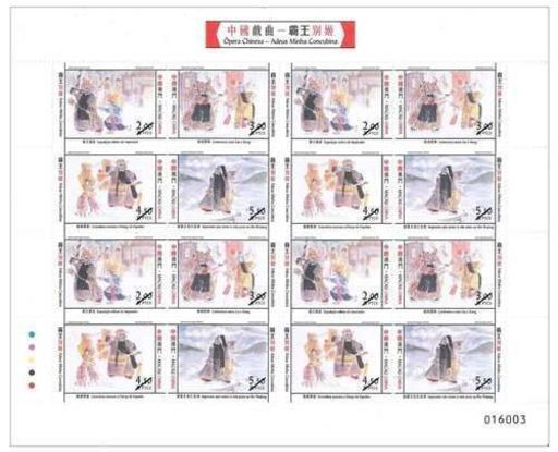 是次发行的四枚邮票和一枚小型张由澳门著名画家陈伟辉设计,笔法生动传神,描画了西楚霸王项羽和汉王刘邦争夺天下,以及虞姬忠贞不渝的爱情悲剧,主要情节包括:霸王亲征、刘项对阵、虞姬舞剑、楚霸王乌江自刎、十面埋伏。