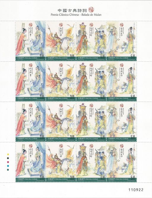 是次发行的四枚邮票和一枚小型张描绘了木兰女扮男装代父从军,征战沙场的传奇故事,邮票主题包括:代父从军、善战立功、拒赏还乡、惊辨英雌。