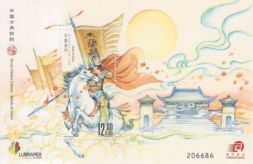 是次发行的四枚邮票和一枚小型张描绘了木兰女扮男装代父从军,征战沙场的传奇故事,邮票主题包括:代父从军、善战立功、拒赏还乡、惊辨英雌。