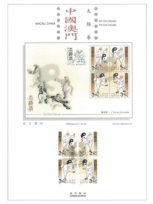 太极拳是中华武术中的瑰宝,亦是全民科学健身的重要运动项目之一。澳门邮政于二零一五年十一月三十日以『太极拳』为题发行新邮品,是次发行包括一套四枚邮票,邮票图案展示了太极拳的招式动作“左云手”、“右野马分鬃”、“左分脚”及“肘底看捶”。