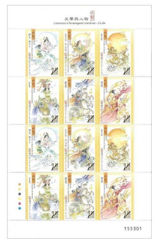 我国伟大诗人屈原留传后世的作品有《楚辞》二十五篇,包括《离骚》、《九歌》、《九章》、《天问》等。澳门邮政继二零零四年发行同一系列以《离骚》为题材的文学与人物邮票后,『文学与人物–九歌』于二零一五年十月三十日发行。
