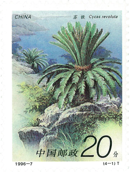 苏铁亦称“铁树”,“凤尾松”,是铁树科的常绿棕榈状树种。其树干粗短,呈圆柱形,顶端两叉状分枝;叶大型,坚硬,羽状分裂。集生于茎顶。花雌雄异株。雄球花黄色,长圆柱形;雌球花扁球形,密被黄褐色绒毛。苏铁常栽植于庭园,也可盆栽供观赏用。此外,它的叶和种子可入药,茎髓可制淀粉。我国有8种苏铁,分布于台湾、华南及西南各地。此套邮票的4幅画面分别为苏铁、攀枝花苏铁、篦齿苏铁,多岐苏铁。由曾孝濂先生采用水粉技法设计。