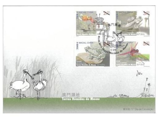 澳门邮政将于二零一五年五月五日以『澳门湿地』为题发行新邮品。是次发行包括一套四枚邮票及一枚小型张,邮票图案所展示的动物包括「弧边招潮蟹」、「大弹涂鱼」、「饰纹姬蛙」、「晓褐蜻」和「黑脸琵鹭」,而小型张以澳门的主要湿地为图案。
