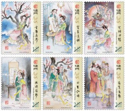 《牡丹亭》全名《牡丹亭还魂记》,与《紫钗记》、《邯郸记》和《南柯记》合称“玉茗堂四梦”,全剧因情成梦、以梦写情,是次发行的六枚邮票描绘了南宋时太守之女杜丽娘和书生柳梦梅生死离合的经典故事情节,包括“重游寻梦”、“写真遗愿”、“冥判回阳”、“幽媾圆梦”、“回生私婚”和“圆驾庆聚”;小型张“游园惊梦”描画了杜丽娘私自游园,在梦中与素不相识的柳梦梅幽会的梦幻迷人情境。