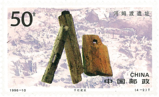 河姆渡遗址位于浙江余姚市以东25公里的河姆渡镇,是我国长江下游地区重要的新石器时代原始村落遗址,也是世界著名的新石器时代遗址。属国家重点文物保护单位。本套邮票四枚,《稻作农业》描画距今7000年一6500年出土的稻谷,用以反映河姆渡先民较为发达的耜耕稻作农业。《干栏建筑》主图是距今7000年一6500年出土的三件带榫卯的木构件,背景为当时发掘出的大片干栏建筑遗迹时的场景。《划桨行舟》主图选用出土的两把木浆(距今7000年一6500年)。《崇鸟敬日》主图采用距今6500年一6001年的“双鸟朝阳纹象牙雕刻蝶形器,该图案表达了河姆渡先民对太阳的崇拜。