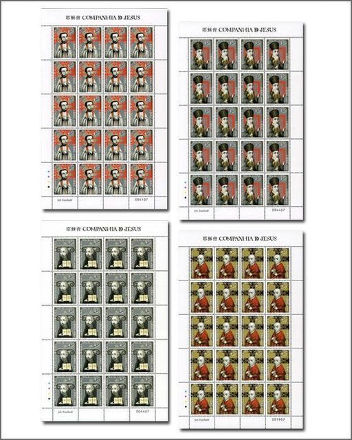 澳门邮政局于二零零六年十一月三十日发行之邮品『耶稣会』;其邮票及小型张凭著其设计独特,于二零零七年在意大利圣加百利国际评奖活动中赢得最高殊荣,获得《最佳宗教邮票奖》之美誉。该套邮品由本澳著名设计师马伟达先生设计,四枚邮票之图案描绘四位耶稣会信徒,分别为利玛窦、圣方济各˙沙勿略、范礼安及贾耐劳;而小型张之图案则描绘耶稣会会祖-圣依纳爵˙罗耀拉的逝世450周年。