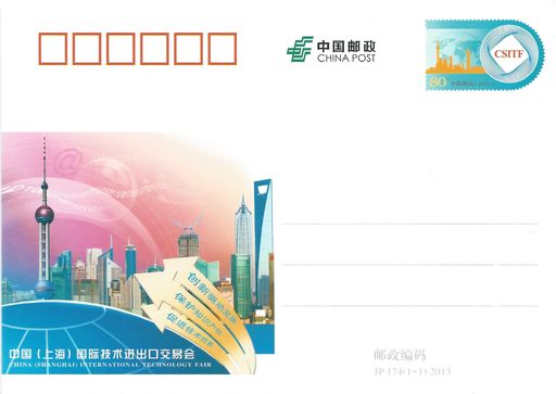 首届中国(上海)国际技术进出口交易会(简称“上交会”),将于5月8日至5月11日在上海世贸商城和上海国际展览中心举办。5月7日下午,上海邮政公司在上海城市规划展示馆隆重举行JP174《中国(上海)国际技术进出口交易会》纪念邮资明信片首发仪式,加印有二维码的纪念邮资片亮相,其增强现实技术为阅读者提供了一个“上交会”对外展示的全新窗口。