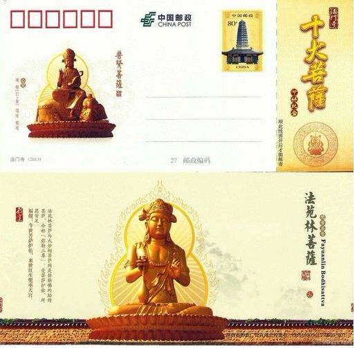 3月15日,中国邮政发行《法门寺》专用邮资图明信片1套1枚。邮资图案为法门寺佛塔和寺院大门。邮资图规格为21毫米×28毫米,邮资片规格为125毫米×78毫米。当天,陕西宝鸡市邮政局在法门寺内的法门寺祈福邮局举行了首发仪式,同时在现场出售以“十大菩萨”为主图加印制作的1套10枚邮资片和小本票。