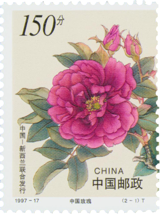 这套邮票是由我国邮电部与新西兰邮政有限公司联合发行。两枚邮票分别展示新西兰最著名的月季品种一“白云之乡”和中国北京的妙峰山玫瑰。月季属蔷薇科,低矮直立落叶灌木,奇数羽状复叶,夏季开花,花数朵同生,深红至淡红色居多,偶有白色。园艺上变种颇多。花及根、叶可入药,有活血、祛瘀、拔毒、消肿作用。玫瑰亦属蔷薇科,落叶灌木,其茎密生锐刺,羽状复叶,上面有皱纹。夏季开花,花朵单生,紫红至白多种色彩,气味芳香。原产我国,久经栽培,可供观赏。花及根入药,有理气、活血、收敛作用。