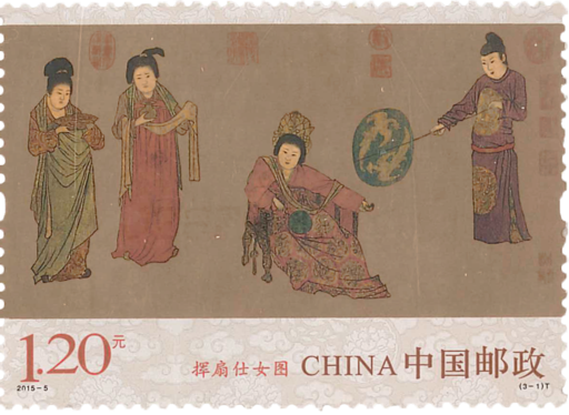 《挥扇仕女图》是一幅描写唐代宫廷妇女生活的作品。全卷所画人物共计十三人,分为五个自然段落。5个段落似离还合,从不同的侧面,刻画了人物在不同场景中的各种心理状态。在画中,作者通过对嫔妃的生活的描绘,表达出她们寂寞、沉闷、空虚、无聊、幽恨暗生的心情。画面结构井然,线条秀劲细丽,赋色柔丽多姿,艳而不俗。