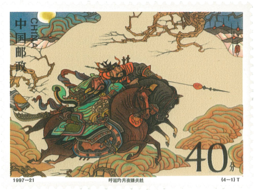《水浒传》系列特种邮票从1987年起陆续发行了4组,本次发行的第五组邮票是该系列的最后一组。其题材选自《水浒传》的结尾部分。呼延灼月夜赚关胜一关胜率军围剿梁山泊。呼延灼匹马单鞭来到关胜营中,言宋江暗与己商议,正要促使众人归顺,但须杀掉林冲等,关胜听后大喜。次日呼延灼又在阵前打败黄信,关胜更喜。当夜,月光如昼,关胜依呼延灼之计,三更偷袭,中了埋伏,被梁山好汉活捉。卢俊义活捉史文恭一因托塔天王晁盖命丧史文恭的箭下,梁山好汉与史文恭结下了不共戴天之仇。此番宋江夜打曾头市,史文恭落荒逃走时,只见阴云冉冉,冷气飕飕,黑雾漫漫,狂风飒飒。史文恭正觉得是晁盖阴魂缠绕时,被卢俊义朝马腿股一刀而生擒。燕青智扑擎天柱一泰安州来了个相扑手,姓任名原,身长一丈,自号擎天柱;两年间在庙会上争交,不曾有对手。燕青为扬梁山威名而下山挑战任原。燕青身材瘦小,二人交手时,他先只瞅住任原的下三路,又先后从其左右两胁钻过,待任原脚步乱了,燕青把任原托起来扔下擂台。轰天雷大破官军一凌振,号称宋朝第一炮手,人称轰天雷。自从凌振投奔梁山后,在与官军的对垒中,多次用火炮大破官军;小型张梁山英雄排座次一梁山泊108将座次如下: