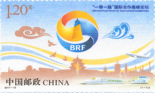 “一带一路”国际合作高峰论坛,于2017年5月14日至15日在中国北京举行,论坛主要活动包括开幕式、领导人圆桌峰会高级别会议三部分。中国国家主席习近平出席高峰论坛开幕式,发表了题为《携手推进“一带一路”建设》的主旨演讲,并主持了领导人圆桌峰会。峰会论坛有29个国家的元首和政府首脑,联合国秘书长、红十字国际委员会主席等重要国际组织负责人以及130多个国家和70多个国际组织的约1500名各界贵宾出席。高峰论坛是“一带一路”提出了3年多来最高规格的论坛活动,是2017年中国重要的主场外交活动,对推动国际和地区合作具有重要意义。“一带一路”国际合作高峰论坛的目的是全面总结“一带一路”建设的积极进展,展现重要早期收获成果,进一步凝聚合作共识,巩固良好的合作态势;共商下一阶段重要合作举措,进一步推动各方加强发展战略对接,深化伙伴关系,实现联动发展;在推进中国经济社会发展和结构调整的同时,推动国际合作,实现合作共赢。为纪念此次高峰论坛,中国邮政发行纪念邮票一套1枚。邮票画面中水纹元素代表了财富和海上丝路,祥云代表了陆上丝绸之路,体现了水利万物和包容、圆融的思想,表达了“加强国际合作,共建一带一路,实现共赢发展”的会议主题。其他元素反映了中国科技发展的成就,表现了联通中外的桥梁和纽带,阐述了此次论坛的“五通”主线,体现了中国与“一带一路”沿线国家一道携手共建、实现和平,发展与繁荣的共同愿景。