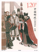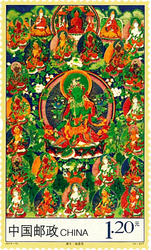 传说唐卡起源于吐蕃时期(7世纪初至9世纪中叶),正式形成于11世纪后半叶并有作品传世,原本是藏传佛教宗教仪式使用的一种宗教绘画,适合藏传佛教僧人游方弘法与观想修习的需要,功能如同一个便于携带的流动神龛。随着内容与形制的演化,唐卡逐渐成为一种独特的艺术样式。本套由票和小型张图案选取的唐卡,均为18世纪作品,清宫旧藏,现存故宫博物院。此五幅唐卡融合藏汉绘画技法,佛、菩萨造像形体优雅,线条流畅,色彩明丽、喜庆,具有浓郁的装饰意味,反映了18世纪前后唐卡的主流审美趋向。邮票所选唐卡中的释迦牟尼佛是佛教创始人,象征汉藏佛教的共同理念;无量寿佛又称阿弥陀佛,寓意长生永在的美好国土;白度母和绿度母的与愿手印象征着祝福,能够帮助众生实现心中的向往;千手千眼观世音菩萨突出展示藏汉佛教慈悲救人、智慧济世的无上情怀。备幅唐卡背面均带有多民族文字题记,表示我国是多民族大家庭,象征着吉祥圆满、万事如意。象征着吉祥圆满、万事如意。