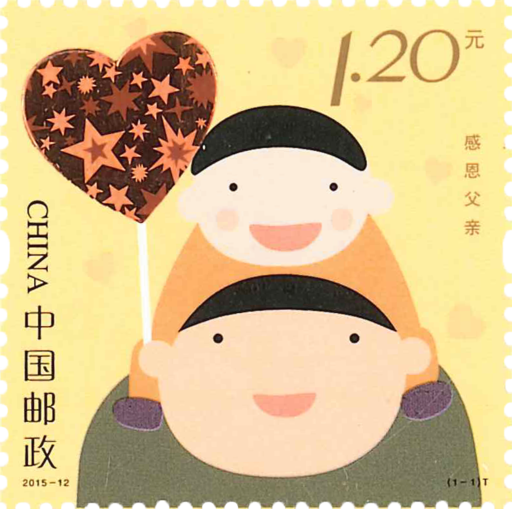 《感恩父亲》邮票用简练概括的图形,明亮活泼的色彩,表现了父子之间浓浓的亲情。父亲对孩子的疼爱以及孩子对父亲的依赖跃然纸上。特别是孩子手拉着“心”形气球,寓意着爱和感恩之情。