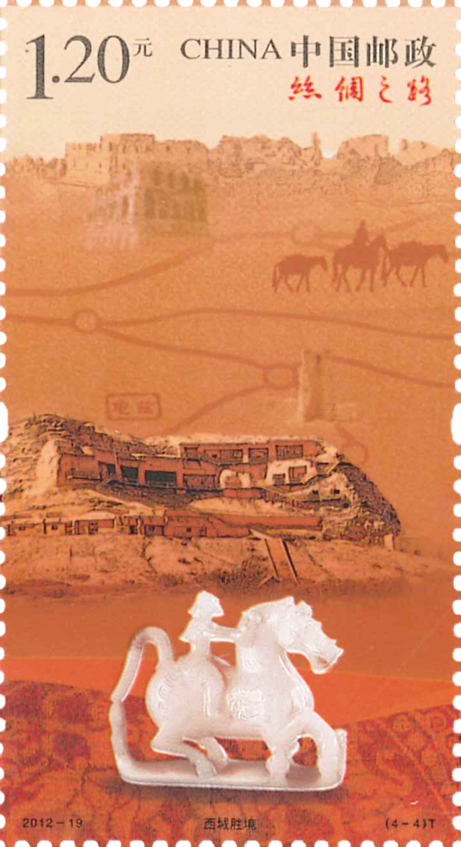 第四枚邮票表现的是龟兹克孜尔千佛洞、烽燧和玉仙人奔马。龟兹克孜尔石窟,位于新疆库车,是龟兹石窟群中规模最大的石窟,遗存有大量西域特色壁画。克孜尔尕哈烽燧是丝绸之路上最古老、目前保存最完好的烽燧遗址。玉仙人奔马.出土于陕西成阳,质地为羊脂玉,反映了西汉时期流行的企慕长生不老、羽化登仙的养生理念。