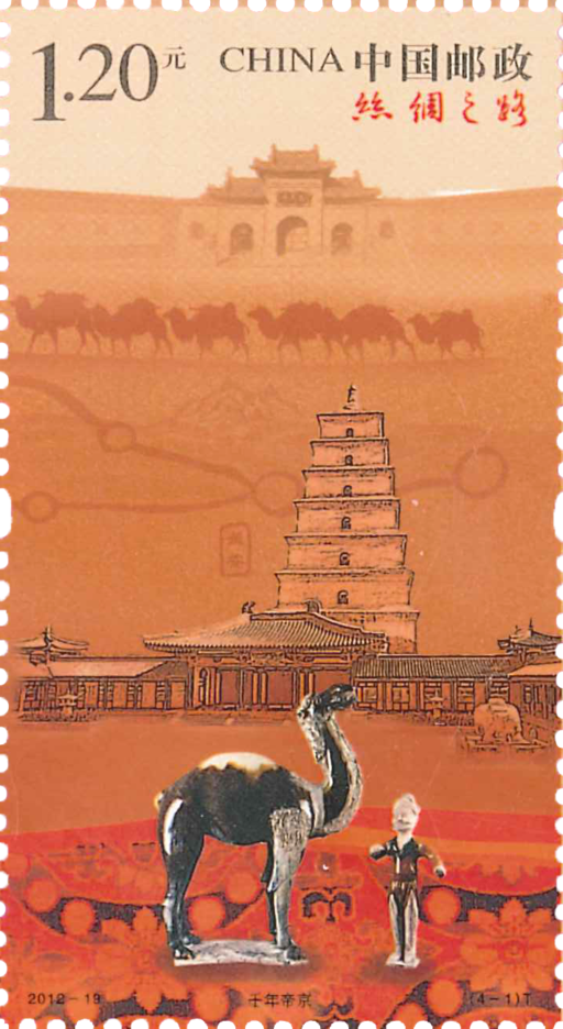 《丝绸之路》特种邮票一套四枚,小型张一枚。第一枚邮票表现的是大雁塔和唐三彩胡人牵驼俑。大雁塔坐落于陕西西安大慈恩寺内,在中国佛教史上具有十分突出的地位。唐三彩胡人牵驼俑,出土于西安。