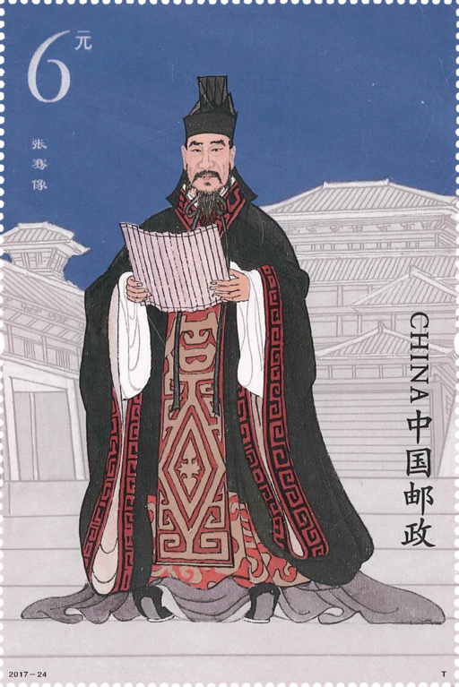 2014年,张骞墓作为“丝绸之路”遗产点之一,入选世界文化遗产名录。小型张为张骞像,以汉代宫廷建筑环境为背景,展现了晚年张骞的英姿。