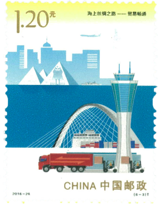 海上丝绸之路是指中国与世界其他地区进行经济文化交流、交往的海上通道。在唐、宋、元的繁盛期,中国境内主要由泉州、广州、宁波三个主港和其他支线港组成,为联合国教科文组织唯一认定的海上丝绸之路起点。丝绸之路不是具体的一条路,而是后世对中国与西亚、中亚、西方所有来往通道的统称。在唐中期前,对外主通道是陆上丝绸之路,之后由于战乱及经济重心转移等原因,海上丝绸之路取代了陆路成为中外贸易交流主通道,在宋元时期是范围覆盖大半个地球的人类历史活动和东西方文化经济交流的重要载体。2013年9月和10月,中国国家主席习近平在出访中亚和东南亚国家期间,先后提出共建“丝绸之路经济带”和“21世纪海上丝绸之路”的重大倡议。这一构思以“政策沟通、设施联通、贸易畅通、资金融通、民心相通、海上交通”为主要内容,为沿线各国经济社会共同发展创造更加美好的明天。“21世纪海上丝绸之路”建设不仅延续古代海上丝绸之路曾经繁荣的海上合作,还赋予其新的时代内涵,使之成为促进共同发展、实现共同繁荣的合作共赢之路,增进理解信任、加强全方位交流的和平友谊之路。邮票背景将海上丝绸之路沿线的知名历史古迹与现代地标建筑及示意性的城市建筑群相结合,由古至今,反映出海上丝绸之路的地理范围和其绵延不绝的悠久历史与欣欣向荣的时代风貌。