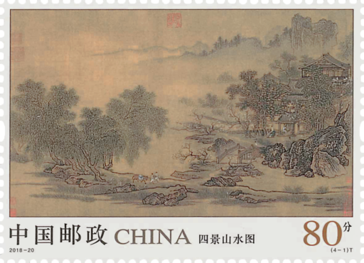 《四景山水图》卷,绢本,设色,纵40厘米,横69厘米。藏于故宫博物院。作者刘松年,南宋宫廷画院画家,“南宋四大家”之一。《四景山水图》邮票一套四枚,选取了南宋宫廷画家刘松年所作《四景山水图》卷中的四段,描绘了南宋都城临安(今浙江杭州)的庭院别墅,表现了此时期山湖楼阁中士大夫的闲逸生活。