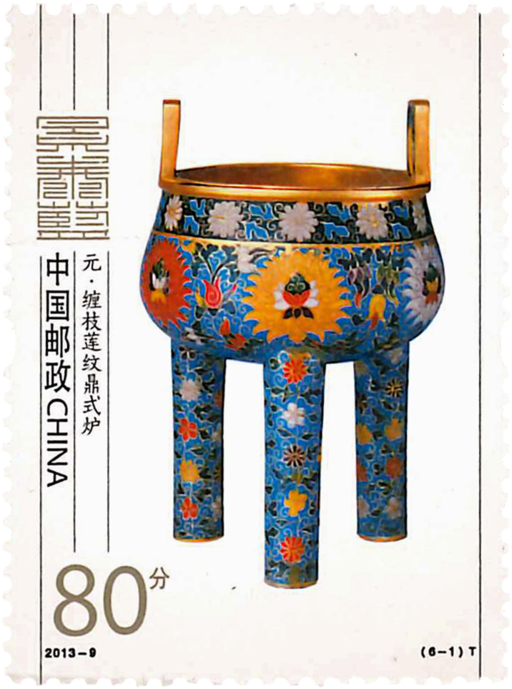 邮票表现的是景泰蓝中的精品,分别是元代缠枝莲纹鼎式炉、明代出戟花卉纹花觚、清代天鸡尊、清代缠枝莲纹多穆壶、清代兽面纹提梁卣、明代缠枝莲纹直劲瓶。