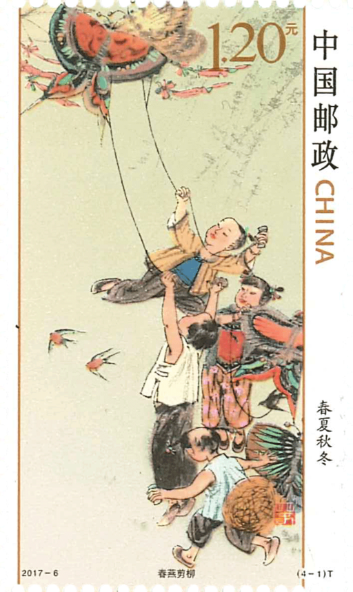 地球在围绕太阳不停地公转的同时,也在绕自身的地轴自转,不过地轴并不垂直于公转轨道面,而是有一个66.5度的倾角。正因为这个倾角的存在,才会使太阳在地球表面的直射点在南、北回归线之间移动,从而形成了春夏秋冬,又称为“四季”。春天始于二十四节气中的“立春”,夏天始于“立夏”,秋天始于“立秋”,冬天则始于“立冬”。四季的概念在黄河流域最为确切,我国劳动人民总结的基本规律是春生、夏长、秋收、冬藏。正是《黄帝内经》等国学典籍所阐述的人与自然关系的基本思想。春夏秋冬四季在中国人眼里不仅是季节的分界,更是人与自然的和谐相处。邮票内容分别为:春燕剪柳、夏荷戏水、秋鸡鸣穗、冬雪映梅。“春”来微风和煦、两岸柳扬,一群幼童在放风筝;“夏”时孩子们摇着小船穿梭在荷花荡,有的顶着荷叶帽,有的摆弄着手中莲花;“秋”日云高万里,遍布金黄色调。孩童们忙着收稻谷;“冬”有飘漫天、梅红绽放,女儿家在忙着贴福字、孩童们蹲在地上放鞭炮,给新年讨个好彩头,一派喜气祥和的景象。