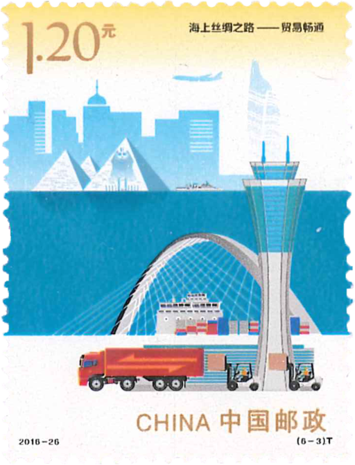 海上丝绸之路是指中国与世界其他地区进行经济文化交流、交往的海上通道。在唐、宋、元的繁盛期,中国境内主要由泉州、广州、宁波三个主港和其他支线港组成,为联合国教科文组织唯一认定的海上丝绸之路起点。丝绸之路不是具体的一条路,而是后世对中国与西亚、中亚、西方所有来往通道的统称。在唐中期前,对外主通道是陆上丝绸之路,之后由于战乱及经济重心转移等原因,海上丝绸之路取代了陆路成为中外贸易交流主通道,在宋元时期是范围覆盖大半个地球的人类历史活动和东西方文化经济交流的重要载体。2013年9月和10月,中国国家主席习近平在出访中亚和东南亚国家期间,先后提出共建“丝绸之路经济带”和“21世纪海上丝绸之路”的重大倡议。这一构思以“政策沟通、设施联通、贸易畅通、资金融通、民心相通、海上交通”为主要内容,为沿线各国经济社会共同发展创造更加美好的明天。“21世纪海上丝绸之路”建设不仅延续古代海上丝绸之路曾经繁荣的海上合作,还赋予其新的时代内涵,使之成为促进共同发展、实现共同繁荣的合作共赢之路,增进理解信任、加强全方位交流的和平友谊之路。邮票背景将海上丝绸之路沿线的知名历史古迹与现代地标建筑及示意性的城市建筑群相结合,由古至今,反映出海上丝绸之路的地理范围和其绵延不绝的悠久历史与欣欣向荣的时代风貌。