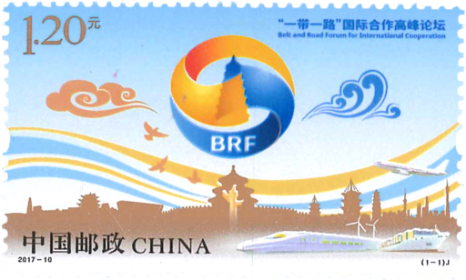 “一带一路”国际合作高峰论坛,于2017年5月14日至15日在中国北京举行,论坛主要活动包括开幕式、领导人圆桌峰会高级别会议三部分。中国国家主席习近平出席高峰论坛开幕式,发表了题为《携手推进“一带一路”建设》的主旨演讲,并主持了领导人圆桌峰会。峰会论坛有29个国家的元首和政府首脑,联合国秘书长、红十字国际委员会主席等重要国际组织负责人以及130多个国家和70多个国际组织的约1500名各界贵宾出席。高峰论坛是“一带一路”提出了3年多来最高规格的论坛活动,是2017年中国重要的主场外交活动,对推动国际和地区合作具有重要意义。“一带一路”国际合作高峰论坛的目的是全面总结“一带一路”建设的积极进展,展现重要早期收获成果,进一步凝聚合作共识,巩固良好的合作态势;共商下一阶段重要合作举措,进一步推动各方加强发展战略对接,深化伙伴关系,实现联动发展;在推进中国经济社会发展和结构调整的同时,推动国际合作,实现合作共赢。为纪念此次高峰论坛,中国邮政发行纪念邮票一套1枚。邮票画面中水纹元素代表了财富和海上丝路,祥云代表了陆上丝绸之路,体现了水利万物和包容、圆融的思想,表达了“加强国际合作,共建一带一路,实现共赢发展”的会议主题。其他元素反映了中国科技发展的成就,表现了联通中外的桥梁和纽带,阐述了此次论坛的“五通”主线,体现了中国与“一带一路”沿线国家一道携手共建、实现和平,发展与繁荣的共同愿景。