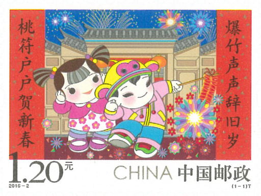 春节俗称“新春”,是中华民族最隆重的传统节日。拜年是民间的传统习俗,是人们辞旧迎新、相互表达美好祝愿的一种方式。在农历春节里,一张张喜气洋洋的笑脸,一声声“给您拜年啦!”,一句句“新年快乐,万事如意!”的问候,使节日洋溢着浓浓的喜气和温馨,体现出中华民族特有的人情味。中国民间有“开门爆竹”一说。即在新的一年到来之际,家家户户开门的第一件事就是燃放爆竹,以爆竹声除旧迎新。邮票画面中,“欢欢”戴着“猴帽”双手高举竹竿,上面挂着火红的正在燃放的鞭炮,炮花如绽放的春花,绚丽多彩;“喜喜”双手捂耳,一脸喜悦,笑逐颜开。两侧吉祥寓意的对联:“爆竹声声辞旧岁桃符户户贺新春”,烘托出过大年喜庆祥和的新年气氛。