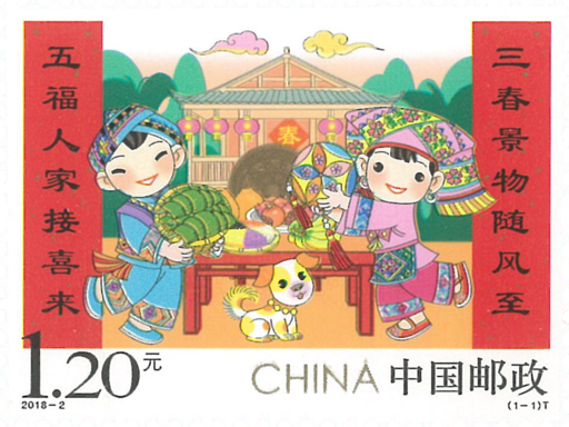 此套邮票是《拜年》系列之四。这次,邮票主角“欢欢”和“喜喜”在壮族聚居区向全国各族人民拜年。画面中的粽子象征着富裕丰收,热情好客的壮家人过年时就会拿出最好的食物招待客人。绣球则是壮家人的吉祥物,是壮家人传递爱情、亲情、友情的民族文化使者。中间桌子上摆放着柚子、香蕉、五色饭等当地特色水果和食物。打开的石榴籽粒饱满、颗颗相抱,形象地表现出习近平总书记提出的各民族要“像石榴籽那样紧紧抱在一起”的贴切比喻。背景衬以铜鼓和当地民居建筑,两侧的春联点明了“三春景物随风至,五福人家接喜来”的新春主题,整个画面轻松愉悦,洋溢着新年的喜庆画面,也体现出我们这个团结统一的多民族大家庭,在中国共产党的领导下,幸福生活,共筑中国梦的美好寓意。