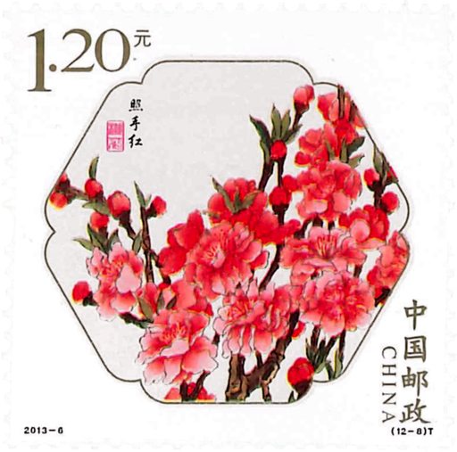 桃花是我国最古老的名花之一,历史久远,早在《诗经》中就有关于桃花的诗句:“桃之夭夭,灼灼其华”。我国桃花品种极为丰富,复瓣形似梅红人,重瓣形似牡丹,红的耀眼,灼灼欲燃;白的夺目,莹莹似雪;粉的如妆,娇媚可人。姚花每年三四月间开放,花期可持续一个月左右。邮票展示了十二个桃花品种,分别是:白碧桃、单粉、品霞、紫叶桃、瑕玉寿星、碧桃、五宝桃、照手红、绿萼垂枝、二色桃、菊花桃、绯桃。