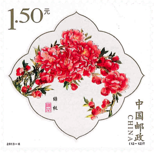 桃花是我国最古老的名花之一,历史久远,早在《诗经》中就有关于桃花的诗句:“桃之夭夭,灼灼其华”。我国桃花品种极为丰富,复瓣形似梅红人,重瓣形似牡丹,红的耀眼,灼灼欲燃;白的夺目,莹莹似雪;粉的如妆,娇媚可人。姚花每年三四月间开放,花期可持续一个月左右。邮票展示了十二个桃花品种,分别是:白碧桃、单粉、品霞、紫叶桃、瑕玉寿星、碧桃、五宝桃、照手红、绿萼垂枝、二色桃、菊花桃、绯桃。